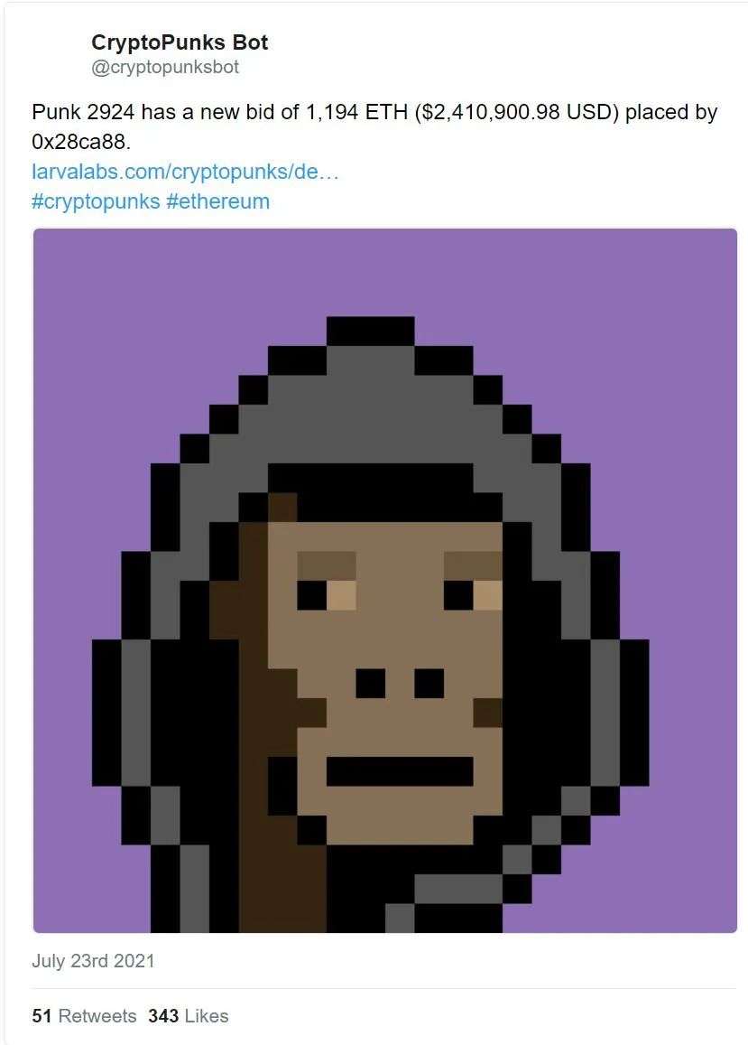 2021年8月,一张CryptoPunk像素头像拍卖出了1201ETH(约合375万美元)的高价,拍下这张头像的,是478个人。