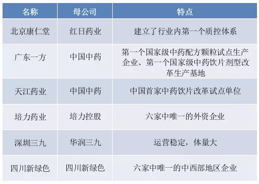 2002年至2004年,药监部门先后通过了天江药业、一方药业(后被天江药业并购)、康仁堂(后被红日药业并购)、华润三九药业、四川新绿色药业、南宁培力药业等6家中药配方颗粒试点厂家。