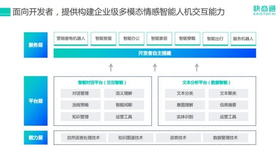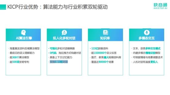 为了提供构建企业级多模态拟人化人机交互能力,快商通智能人机对话开放平台KICP具备了全球领先的自然语言处理、知识图谱、声纹识别、语音识别等多模态人机交互能力与知识构建能力,并搭建了能够配合自研模型算法的多模态数据库。在强大的AI算力和持续研发迭代下,KICP的产品延展性和底层AI的适配性不断提高,成为能读懂、看懂、听懂、有记忆、自学习,真正理解人类语言与情绪的“智能情感机器人”。