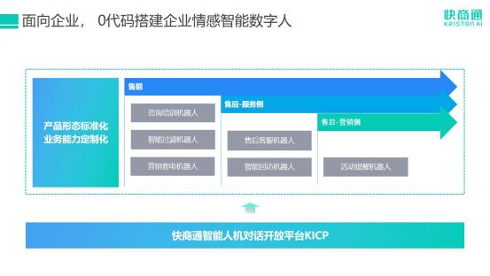 目前,企业开发者可在快商通智能人机对话开放平台KICP中自主搭建营销套电机器人、智能客服、智能办公、智能家居、智能穿戴、智能出行、服务机器人等,并生成包括AI智慧医疗解决方案、AI智慧教育解决方案、AI智慧公检法解决方案、AI智慧金融解决方案、AI智慧政务解决方案等行业高效的全生命周期数字化智能营销解决方案。