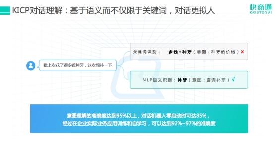 基于KICP打造的快商通智能营销套电机器人也是能读懂人心的拟人化人机交互客服机器人,访客对话意图识别准确率高达95%,再经过企业实际业务应用训练和自主学习后,意图识别准确率可以达到92%~97%。