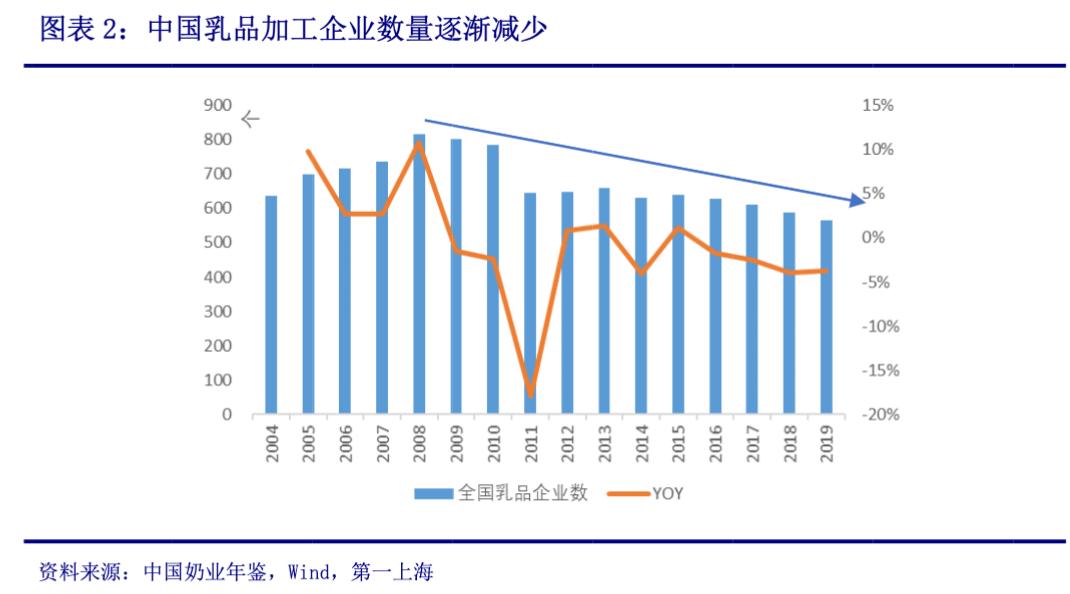 常温奶市场集中度非常高,据浙商证券数据,截至2020年,两强的常温奶市占率约66%。并且向头部集中的现象还在愈演愈烈,据中国奶业年鉴,从2008年开始,中国乳品加工企业的数量持续下滑,长尾玩家纷纷退出市场,两强市占率逐年提升。