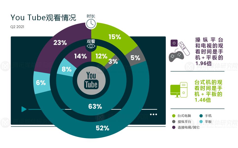 YouTube在社交媒体上的流媒体服务中扮演着极为重要的作用。2021年第二季度,YouTube的大部分浏览量(63%)和观看时间(52%)来自手机。对于小的屏幕设备,YouTube上可以浏览内容的同时观看视频。