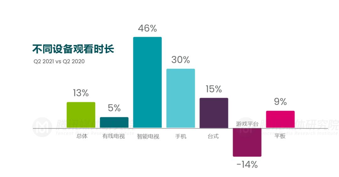 多年来,设备的观看时间都呈现出增长的趋势。但在2021年第二季度,罕见地出现了设备收看时长下降,游戏平台下降了14%。虽然其他电视设备也在增长,智能电视增长了46%,联网电视设备增长了5%,但游戏机却下降了14%。在小屏幕设备中,手机增长了30%,台式机增长了15%,平板增长了9%。在所有设备中,总观看时间比去年增加了13%。