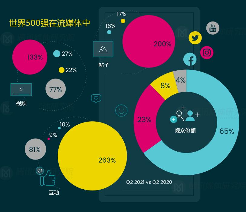 从整体上看,世界500强企业在2021年第二季度的表现同比去年更为出色,因为品牌通过更多的帖子和视频参与社交媒体,因此在所有平台上的参与度都有所提高。与前一年相比,世界500强品牌在Instagram上的发帖量有所增加,2021年第二季度的发帖量和视频量分别增加了200%和133%,但互动数仅增长了9%。全球500强更偏好于在Twitter中参与互动,互动数增长了263%。与此同时,世界500强更依赖于Facebook平台,因为该平台的受众份额达到了65%,而Instagram则以23%的份额位居第二。