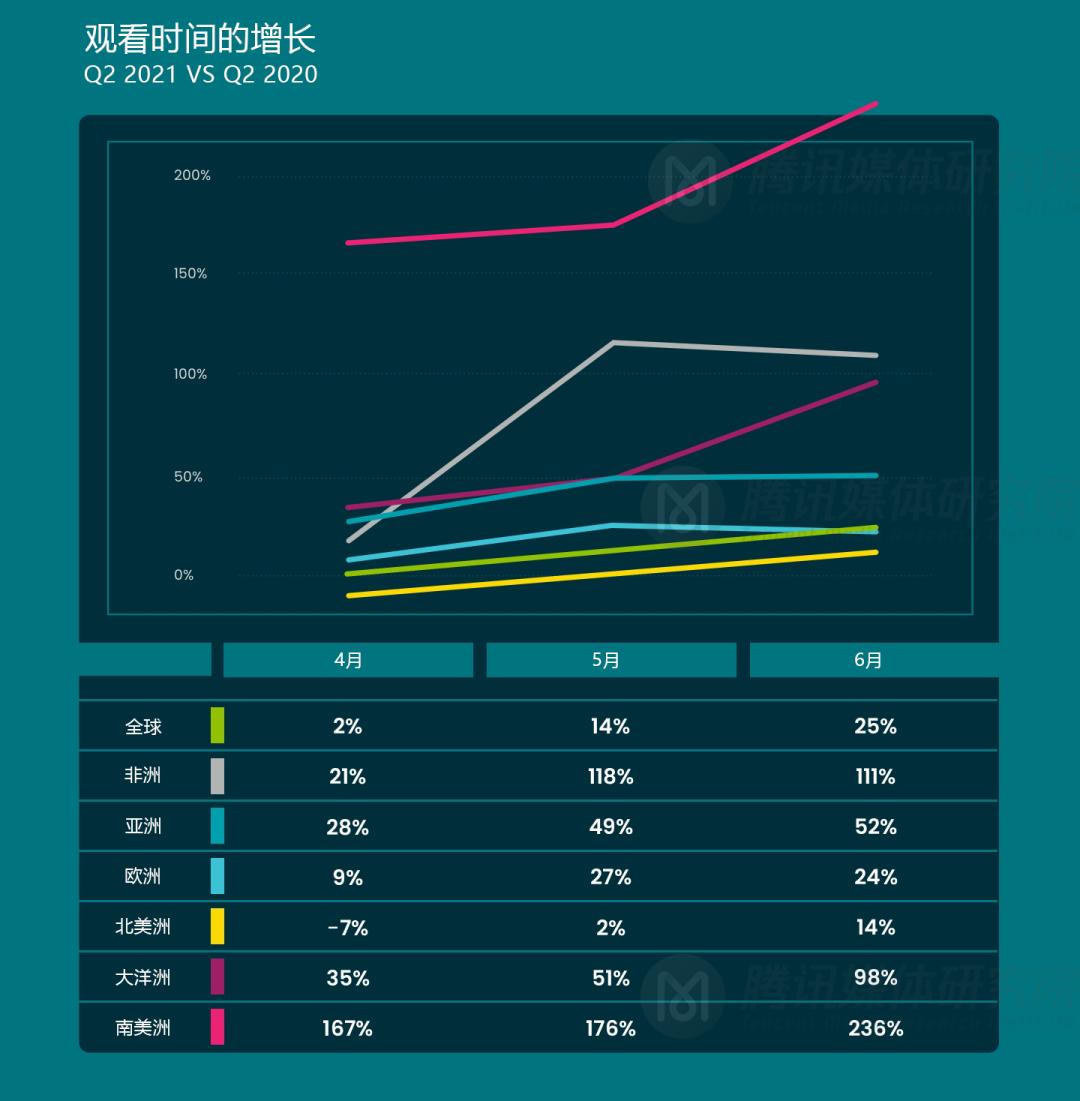 下图为2021年2季度对比2020年2季度的各月同比观看流媒体时长增长情况