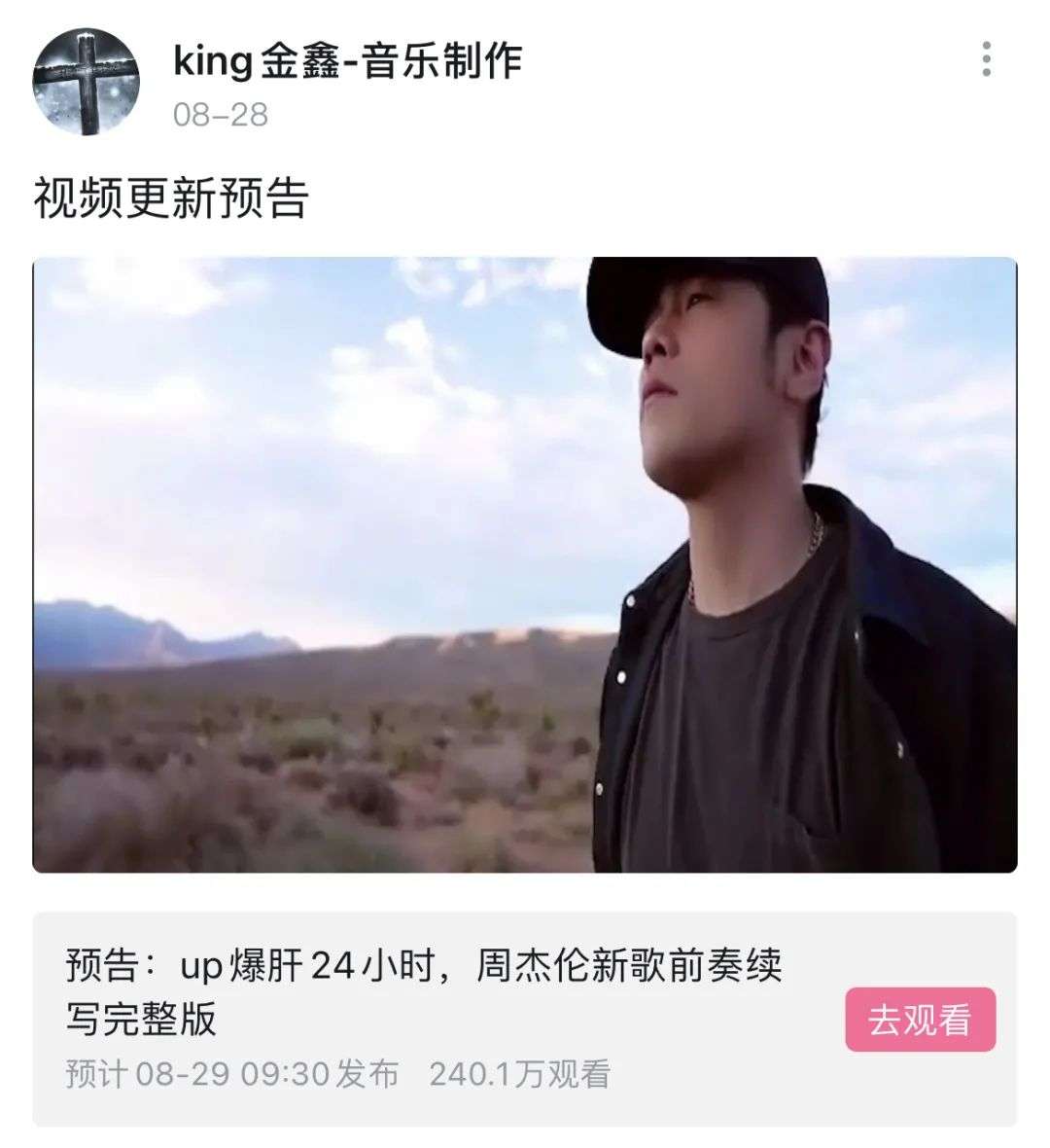 于是在8月28日,king金鑫发布了一条视频更新预告,宣布自己将爆肝24小时,把周董发布的前奏续写成一首完整的歌曲。
