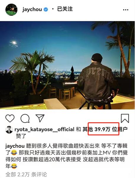 原来,许久未发新歌的周董表示,如果帖子的点赞数超过20万,他就会在几天后放出几秒新歌的前奏和MV。