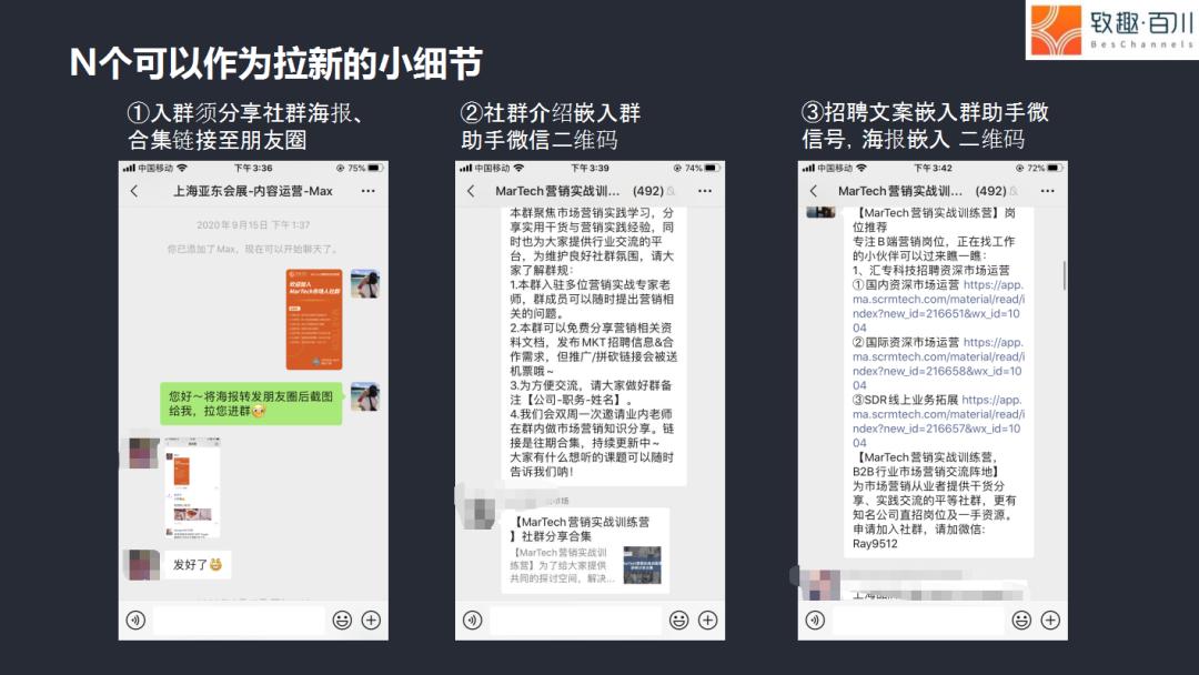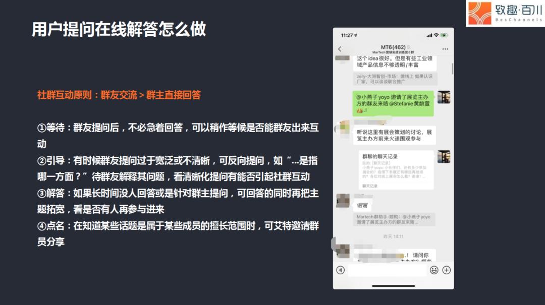 后面社群成员会养成的习惯是,要找某方面市场营销的资料,他会先来问你,这点非常重要——如果先问你的话,你就有主动权,因为致趣百川也产生很多内容,如果是致趣有的内容,肯定优先发致趣产生的内容,如果没有,再去给其他可以满足他需求的内容。
