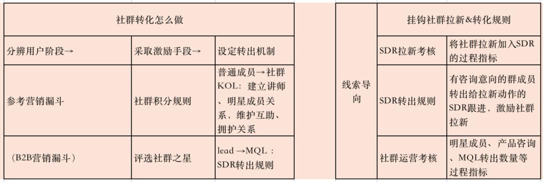 “需要特别明确的是,SDR的转出标准和统计。我们要品效合一,要量化,最后业绩都是产出于社群,社群到底起到了多大的效果。开始没有和SDR的KPI挂在一起,SDR积极性是不高的,后来说绩效设计加进去了,他们拉新的积极性就高了很多”。