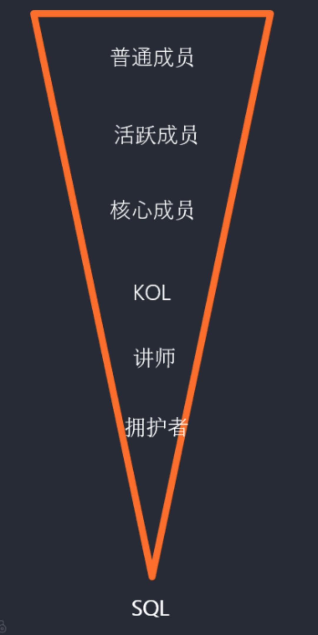 刚进来的成员,什么都不了解,他就是一个普通成员;逐渐的,他开始活跃起来,成为了里面的活跃成员;之后,他开始认可社群,这时候他成为了里面的核心成员;再往后就是社群里的KOL,他在社群里开始拥有自己的话语权;如果有机会,他会成长为讲师,或者另外一部分人有合作的需求,便成为了我们的线索。当然,我们是希望能一步步促进它往SQL这边走。