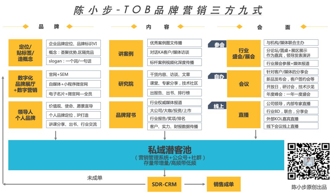 简单来说,就是通过“三方九式”打造品牌实现获客,从品牌定位出发,提出品牌标签,不断强化品牌背书,然后基于潜在客户的所有触点都是营销点的思路,从领导人个人品牌,官网,微站,案例,会议活动,直播,到内容的社交媒体传播,把潜在客户群沉淀到私域潜客池,再通过SDR进行线索清洗,将高价值线索转到销售一对一洽谈,未成交的潜客继续孵化,这是整体的TOB营销闭环。
