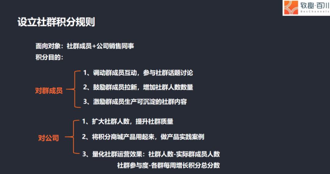 需要特别提到的是,为有效促活,致趣百川还创新设立了群奖励和群积分规则。群奖励适用于部分群成员活跃的场景,比如他们会在月底发起群内投票选出三位社群贡献之星,并提供鼓励奖品;而群积分适合较多人活跃的社群场景,通过使用积分工具和积分商场,推行积分规则并迭代优化。