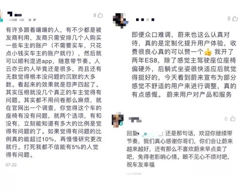另外,早在今年3月,有蔚来粉丝反馈它的座椅设计问题,车主们组织了“座椅发声总群”进行维权,向官方反馈,希望改进座椅设计。这一合理的诉求下,却有狂热粉的不满,“跟着嚷嚷的人,有不少都是被友商利用了。”争论发展到最后,甚至演变成人格攻击。