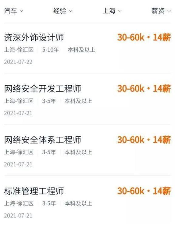 7月28日,小米科技创始人、董事长雷军在微博发布小米汽车自动驾驶部门招聘信息。此次招聘计划招募500名自动驾驶技术人才,包括数据中台、车载基础架构、毫米波算法、前端平台开发、嵌入式软件等近30个岗位,目标是自研L4级智能驾驶能力。值得注意的是这些招聘岗位前都标注了“急”的字样。从招聘网站中可得知,小米汽员工月薪在30-60k之间,一年可拿14薪。