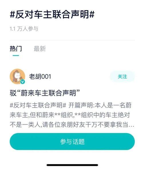 声明一公布,就在行业引起了轩然大波,于此同时,在蔚来APP上也出现了“反对车主联合声明”的话题,有车主表示,不想被代表,强烈要求蔚来召回;还有车主直言,这种声明简直给蔚来添乱,给所有车主蒙羞。