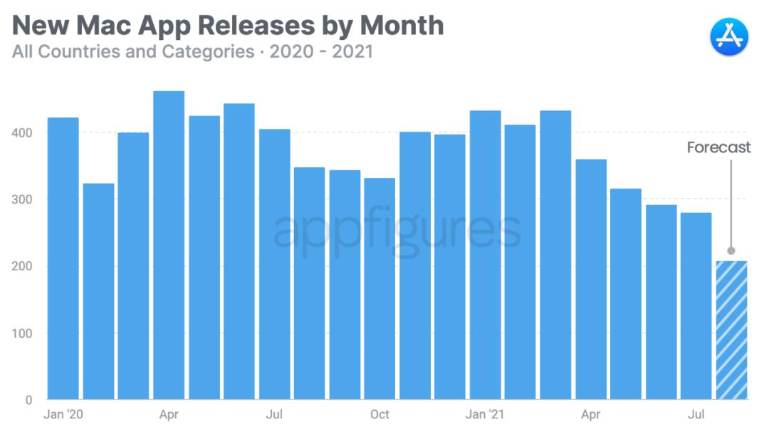 据应用分析公司AppFigures透露,自今年年初以来,Mac app Store上的新应用数量一直呈现下降趋势。“2020年,开发者平均每月向Mac App Store发布392款新应用。到2021年为止,新Mac应用的平均数量已经下降到343个。”