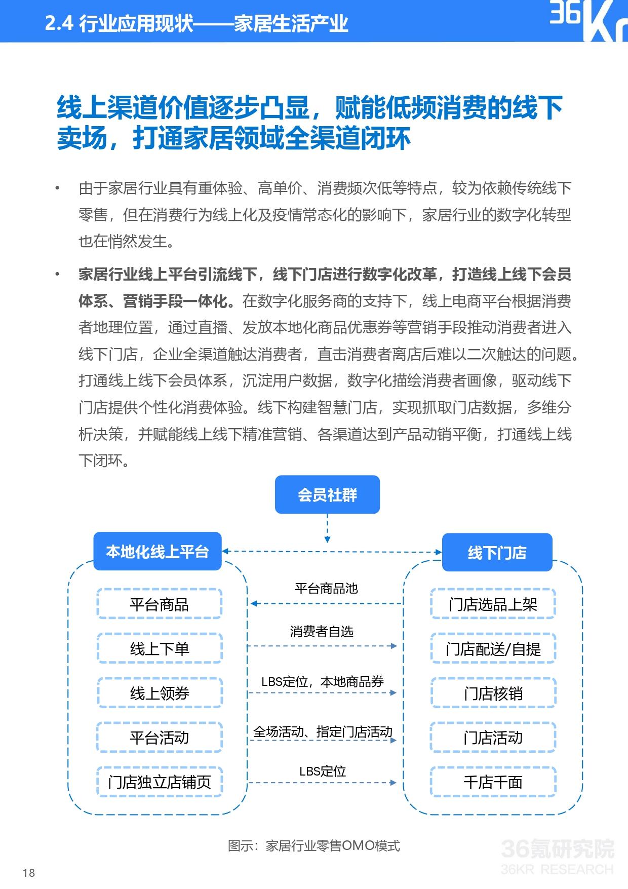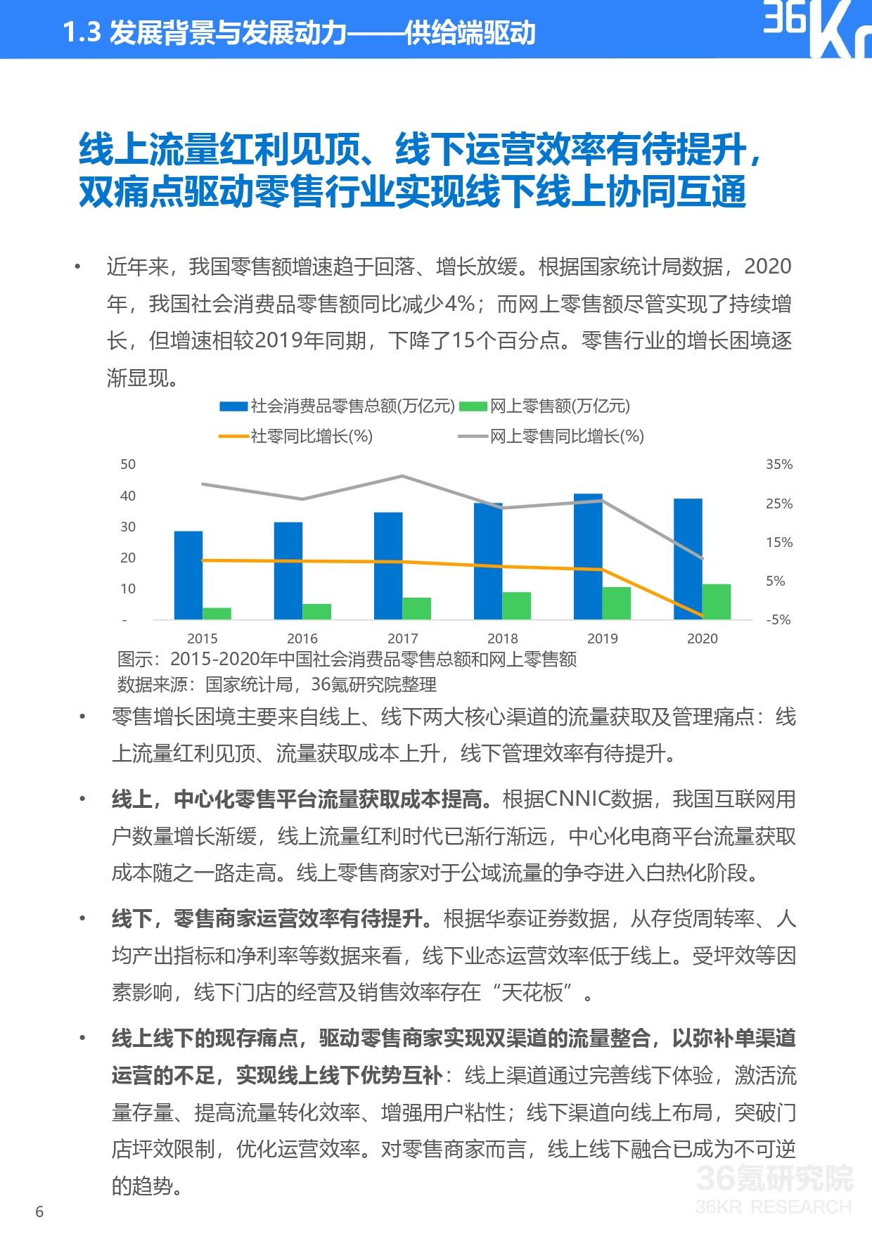 供给端线上流量获取成本上升、线下管理效率有待提升和消费端触点多元化等新形势,驱动零售商家实现线上线下全渠道的整合,为消费者提供更为个性化的体验:线上渠道激活流量存量、提高流量转化效率、增强用户粘性,为线下引流;线下渠道为客户提供优质购物体验,并为向线上布局做好客流储备,突破门店坪效限制,优化运营效率。