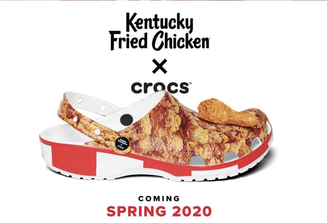 在跨界这件事上,Crocs更是不遗余力,一边和巴黎世家合作设计奢侈品,一边和肯德基共同推出炸鸡洞洞鞋——你能把全家桶穿在脚上,再配上吸睛的炸鸡智必星。
