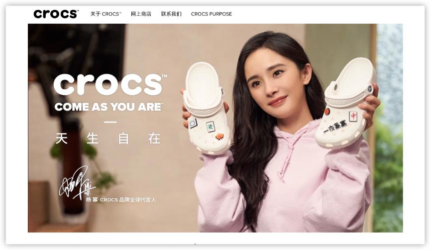 2020年初,Crocs宣布中国艺人杨幂成为其2020年全球品牌代言人。Crocs表示,这次合作有助于品牌更好地与中国消费者产生情感联结。此后,杨幂进入李佳琦直播间,为洞洞鞋宣传带货。