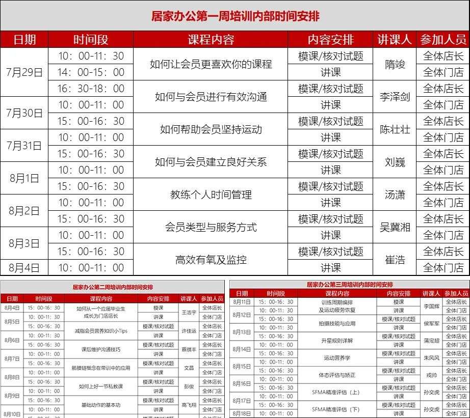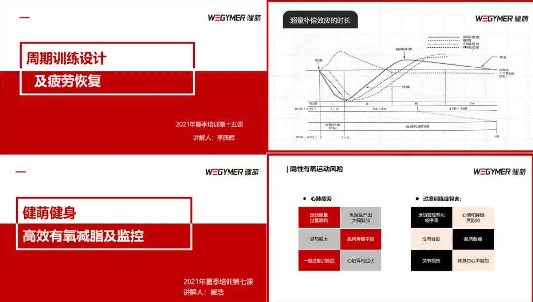 所有课件都由培训部及资深教练多次打磨试课完成,主题包括“如何帮助会员坚持运动”“训练周期编排及运动疲劳恢复”等。