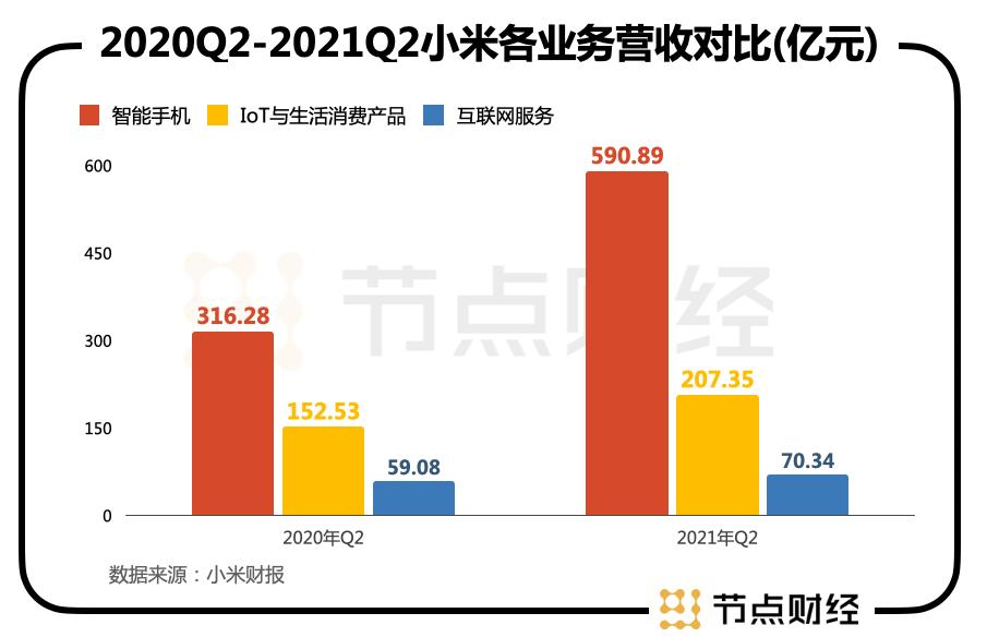此外,小米的互联网服务收入由2021年Q1的66亿元增加7.0%至2021年Q2的70亿元。