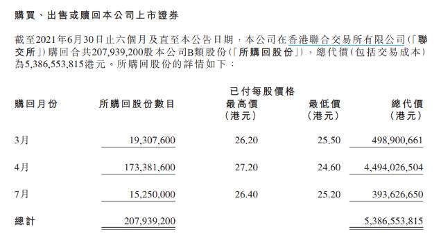 财报显示,截至今年6月30日,小米回购金额已经达到53.87亿港元的股票。