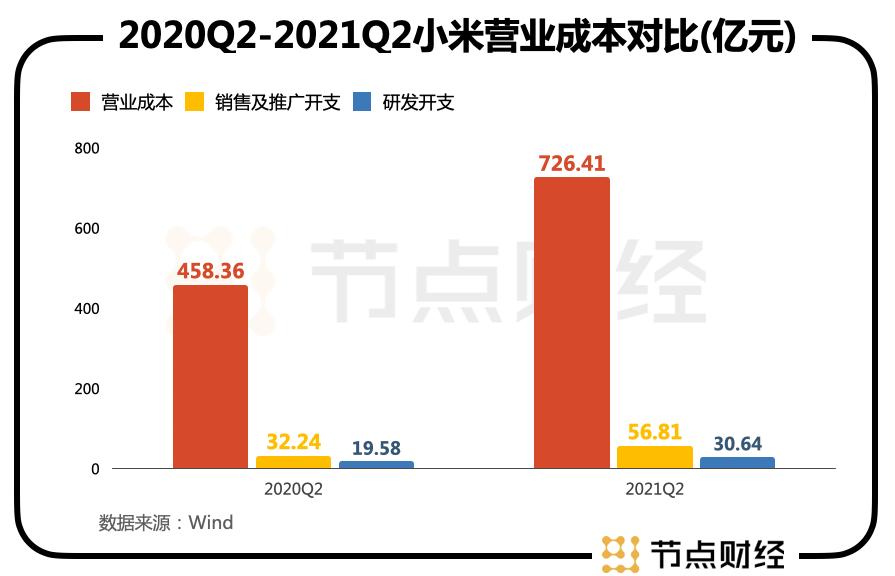 业绩增长之余,小米的销售成本也在扩大。今年Q2,小米销售成本为726.41亿元,去年同期为458.36亿。小米研发费用研发开支由2021年Q1的30亿元增加1.7%至2021年第二季度的31亿元,增长并不明显。