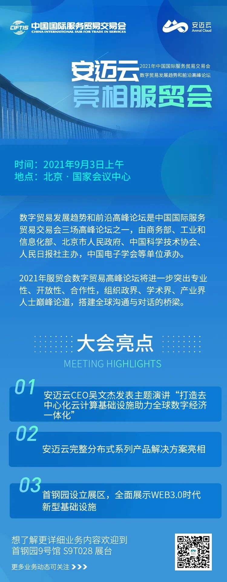 同样值得关注的是,安迈云在9月2日-9月7日将会在首钢园(会场)9号馆S9T028设立展位,集中展出安迈云在去中心化云计算领域多项重要成果,全面呈现分布式系列产品解决方案。欢迎感兴趣的朋友来到会场,与我们共话数字文明新世界。
