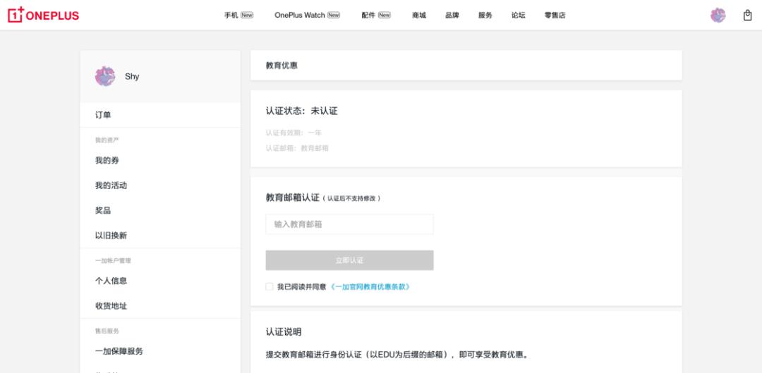 大专及大专以上的在读高校生、教师、教职员工,均有资格享受一加教育优惠。登录自己的一加账户后,在「个人中心 - 教育优惠」板块绑定验证 .edu.cn 教育邮箱,即可在「我的资产」中查收并使用优惠券。认证有效期为一年,在教育邮箱有效的情况下,次年可重新认证并领取教育折扣。