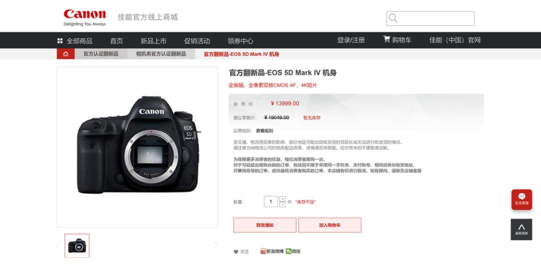 佳能官方认证翻新品包括相机套机、机身、镜头、配件等,优惠幅度依具体型号而定,最高可达新机定价的 20% 以上,以 EOS 5D Mark IV 机身为例,官翻定价 13999 元,新机定价则为 19049 元,差价达到 5000 元。
