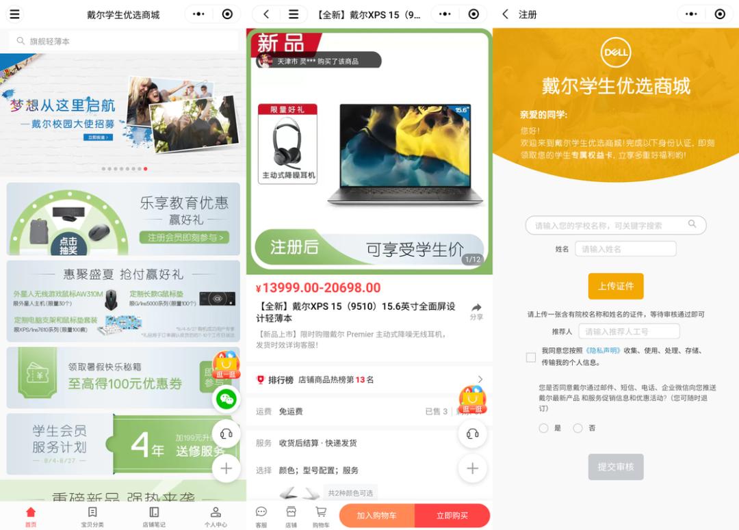 打开小程序后,按界面引导,通过微信授权登录,上传含有院校名称与姓名的学生证、录取通知书等有效证件照片,审核通过后即可享受戴尔学生会员权益。报名申请「戴尔校园大使」还可获得更多福利,包括戴尔实习证明、奖金等。