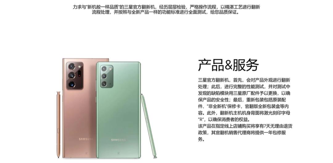 三星官方翻新机是中国三星通过官方渠道回收,检测维修后再次上架销售的智能手机、手表、耳机等,均在后盖激光镌刻字母与新机区分,共有三种版本:7D 版来自消费者 7 天无理由退货,S 版来自 15 天无理由换货,经检测正常,重新塑封上架;R 版与 Apple 官翻设备类似,包括实体店展示机、质量问题退换、以旧换新回收等,由三星工厂全面维修、翻新和检测后再次销售。三种版本的官翻机品质均与新机无异,享受一年保修,支持 7 天无理由退货。