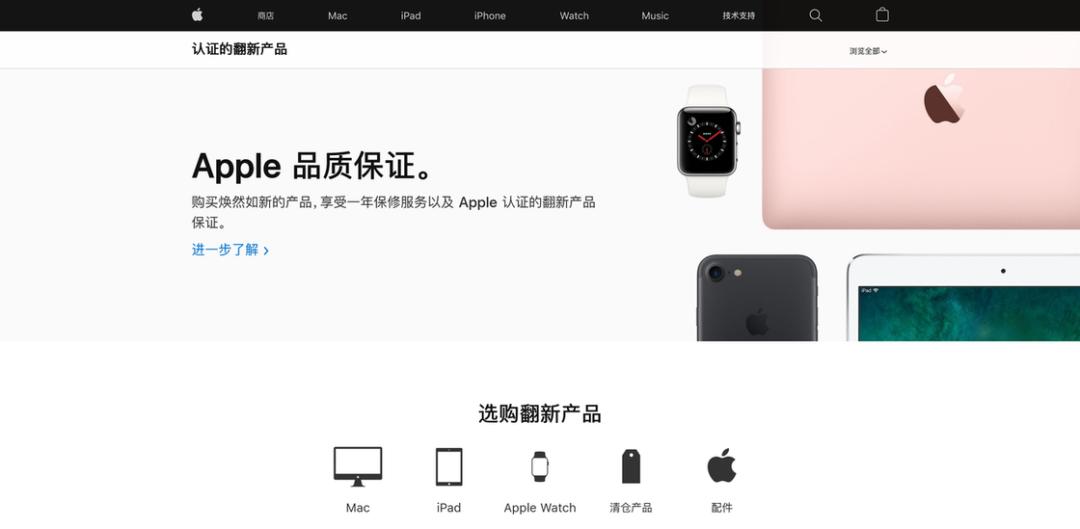 Apple 认证的翻新产品主要包括 Mac、iPad 和 Apple Watch,有时也会上架清仓产品和 Apple Pencil 等配件,iPhone 较为少见。官方翻新设备多半来自保修期内出现故障的返厂机器,也包括通过 Apple Trade In 换购计划回收的旧机型等,替换新零件、彻底清洁并更换电池和外壳后再次销售。官翻设备的外观和体验与新机相仿,享受一年有限保修服务以及最长达 90 天的免费技术支持,还支持加购 AppleCare 服务。