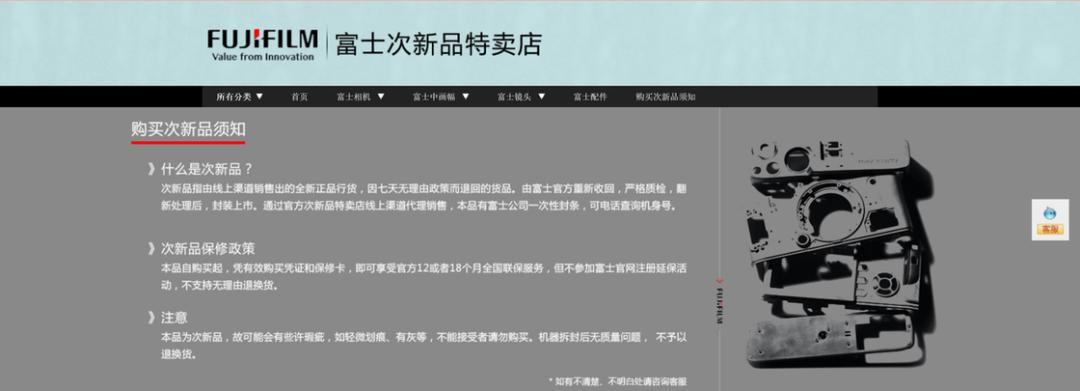 富士次新品指的是线上渠道销售出的全新正品行货,因七天无理由政策而退回的产品。由富士官方重新收回、严格质检、翻新处理后再次封装上市,通过官方授权经销商代理销售,可能存在轻微划痕等瑕疵。富士次新品包装外贴有富士公司的一次性封条,可通过电话查询机身号,享受官方 12 或者 18 个月全国联保,不支持注册延保和无理由退换货。
