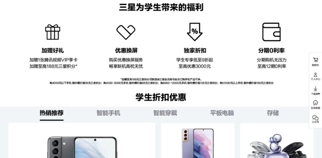 中国三星同样推出了「星助力」学生专享优惠活动,涵盖 Galaxy S、Note、A、Fold、Flip 等系列智能手机,以及平板电脑、智能手表、无线耳机、存储设备等众多品类,最高优惠可达 3000 元,享受 12 期免息分期及优惠换屏服务,加赠腾讯视频 VIP 会员季卡。依订单金额,还可额外获取最高价值 188 元的三星积分,用于兑换实物礼品或优惠折抵券等。