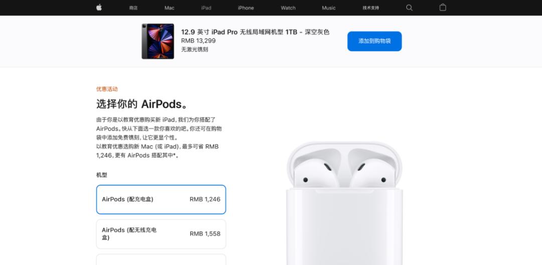 每年秋季学期前夕,Apple 都会推出 Apple Store 教育商店新学期优惠活动,今年也不例外。9 月 27 日前,在线上或 Apple Store 零售店购买指定机型,即可获赠价值 1246 元的基础款 AirPods,亦可补差价升级为配备无线充电盒型号或 AirPods Pro,分别需要 312 元与 753 元。