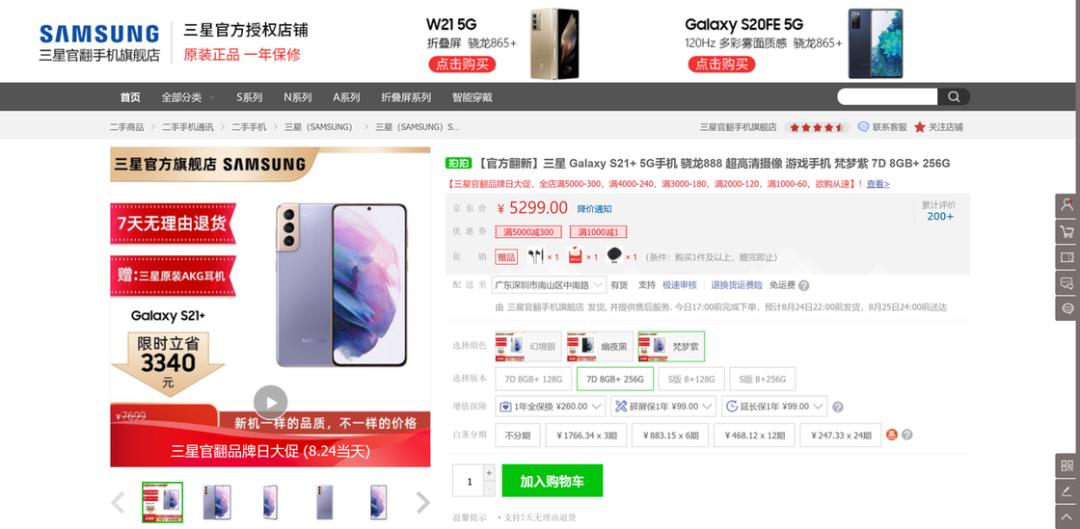 在中国大陆地区,三星官方翻新机的线上销售渠道为京东「三星官翻手机旗舰店」,不同版本的定价不一致,7D 版最贵,约为新款 85 折,可叠加其它优惠券;店铺内另有出厂检测性能完好、外观存在瑕疵的「资源机」出售,标注成色,价格最低,95 新的 256 GB 存储空间 Galaxy S21+ 5G 定价 4999 元,比教育优惠低 1000 元。