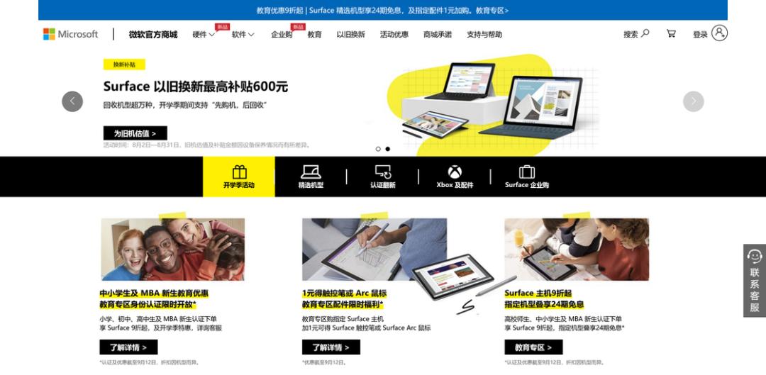 微软官网的 Surface 开学季优惠活动截至 9 月 12 日,Surface Pro 7、Surface Laptop 4、Surface Book 3、Surface Studio 2 等在售机型均享受 9 折优惠,叠享 24 期免息分期及 30 天价格保护。部分指定型号另可加 1 元换购价值 636 元的 Surface 触控笔或价值 609 元的 Surface Arc 鼠标,折抵券二选一,不可兼得。
