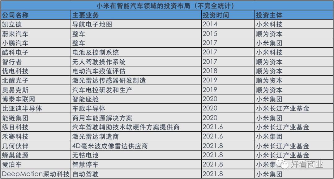 官宣造车前,雷军通过旗下的顺为资本或小米集团及子公司,已经在整车厂、自动驾驶、车联网、智能座舱、车用半导体等环节广泛投资。