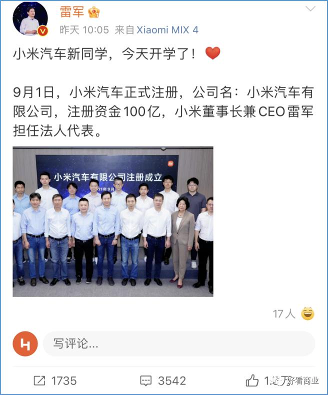 9月1日,他再次解码成功。在全国大小学生开学的日子,雷军在微博官宣“小米汽车”新同学开学,小米汽车正式注册,同时贴出一张小米汽车管理层的合照。没有一丝意外,这条信息迅速扩散并刷屏。