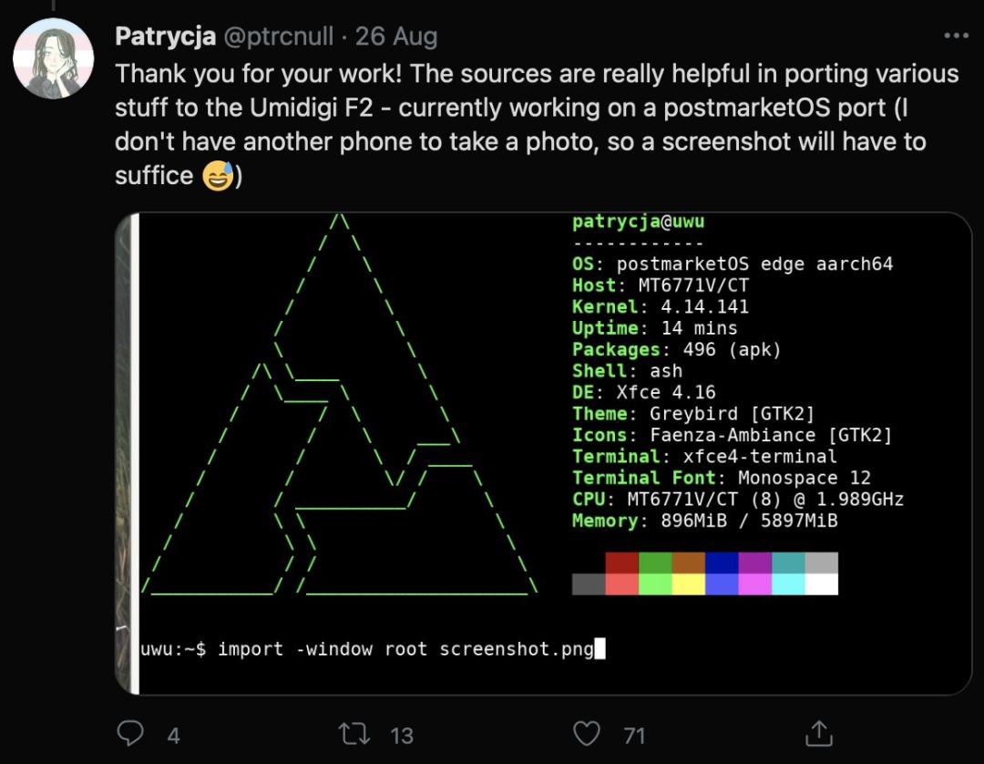 谢谢你的工作! 这些资源对移植各种东西到Umidigi F2上真的很有帮助--目前正在进行postmarketOS的移植