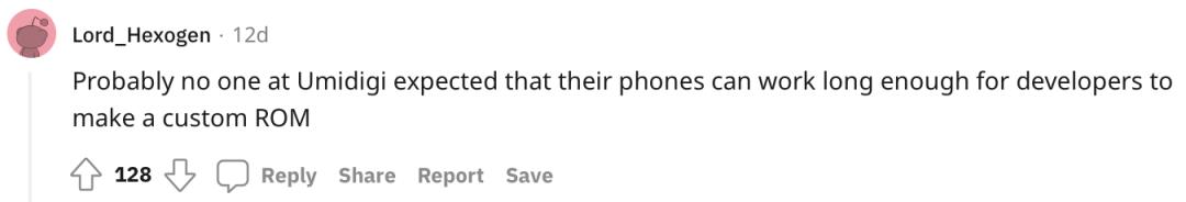 Reddit网友则调侃说,大概UMIDIGI也没想到,他们的手机能坚持这么长时间,竟然有开发者想做一个定制的ROM。