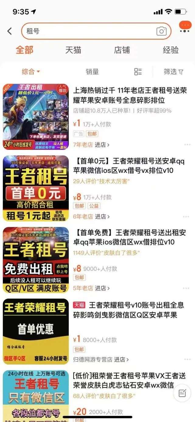 时代财经发现,在各大电商平台和手机应用商店,均能轻易搜到“游戏租号”的服务和应用。除了《王者荣耀》外,《英雄联盟》《和平精英》《原神》等热门游戏账号都能找到相应的租号服务,而且针对微信区和QQ区,苹果和安卓操作系统的手机都有专属账号。