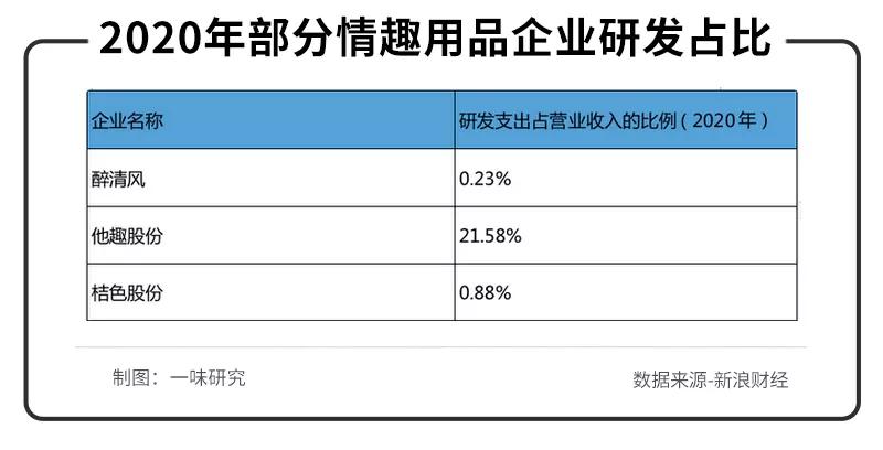 新浪财经曾对醉清风、他趣股份、桔色股份三家情趣用品公司做过分析,数据显示,2020年,醉清风研发费用占比最低。