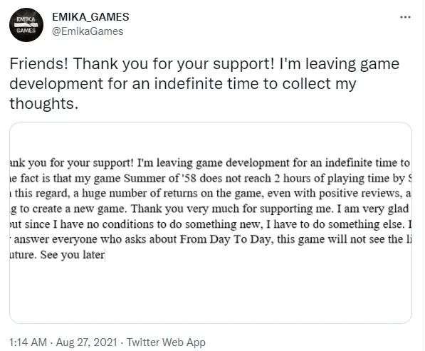 在今年的8月27日,《Summer of '58》的开发商EMIKA_GAMES发布推特宣布,将无限期退出游戏开发工作,原因是他们旗下的独立游戏退款率高得离谱。