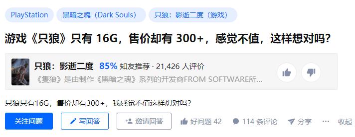 在知乎上曾出现过一个热门提问,它这样问道:“游戏《只狼》只有 16G,售价却有 300+,感觉不值,这样想对吗?”