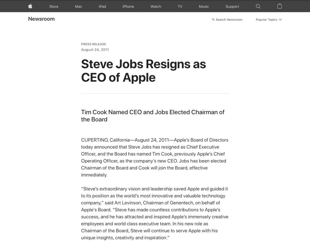 2011 年 8 月 24 日,由于史蒂夫·乔布斯愈发严重胰腺癌病情,苹果在官网发布公告,正式宣布:由时任主管供应链的首席运营官蒂姆·库克,接任苹果 CEO 一职。