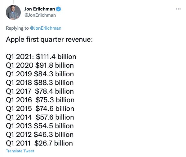 负责全球销售/运营及供应链管理出身的库克,在上任之后不仅带领苹果的股价从当时资本市场预计的「苹果股价即将暴跌」中走出来,还带领苹果达到了前所未有的新速度:仅在 2021 年第一季度,苹果的实际营收额就达到了 1100 亿美元,相当于三星电子(564 亿美元)的两倍,小米(119 亿美元)的九倍之多;即使是与十年之前苹果在 2011 年第一季度的成绩 —— 267 亿美元对比,也是翻了四倍的巨大提升。