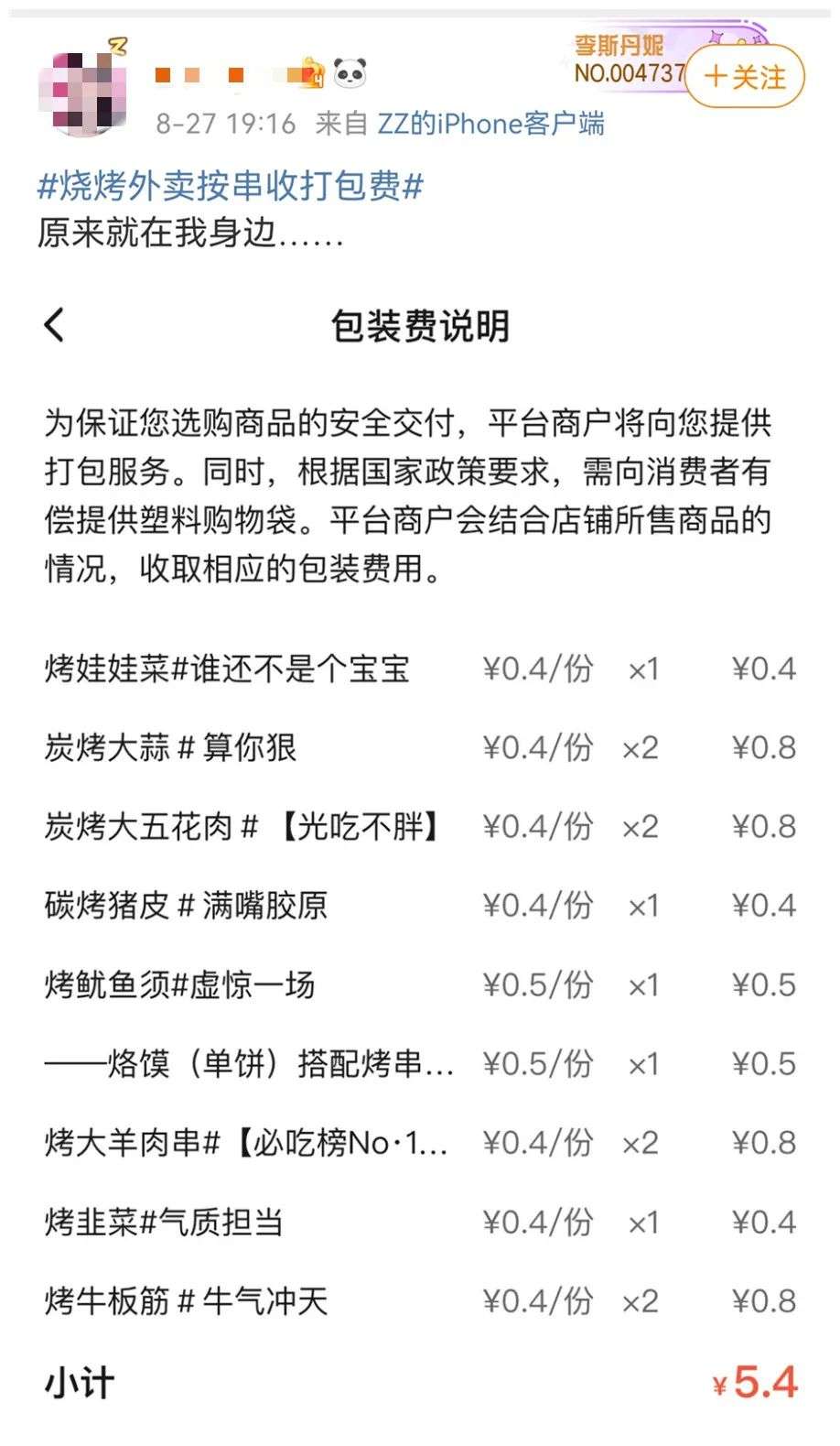 据网友爆料,一些烧烤店、炸串店现在甚至按串打包收费,五花肉、鱿鱼须、娃娃菜等餐品每一串的打包费从0.4元-0.8元不等,“我一共点了12串烧烤,打包费总计5.4元。”